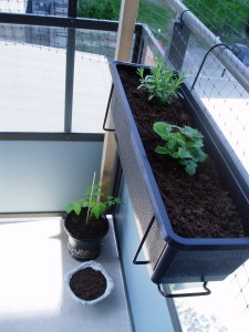 När vi flyttade till den här lägenheten för lite mer än två år sedan gladdes vi båda åt vår balkong. Drömmen om en kruka eller två med lite kryddväxter och blommor föddes redan då – men det är först nu vi satt planen i verket. Nu står de där – tomatplantan i sin svarta kruka bredvid katternas matsmältningshjälpande gräs i den låga vita. I balkonglådan lavendel och smultron – så småningom skall de få sällskap av timjan och basilika som dessvärre var slut.