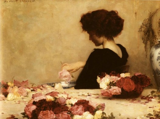 I övrigt tänker jag mig att färgsättningen i just den tavlan är liksom essensen av ”sekelskiftets bleksiktiga rosor”. I detta nu pågår en allvarlig övertalningskampanj från min sida att detta är en fullkomligt lämplig färgssättning (eller ”tema” som det heter i magasinen) för ett bröllop! (Fästmannen är tveksam men har gått med på ”rosa och champagne”) 🙂