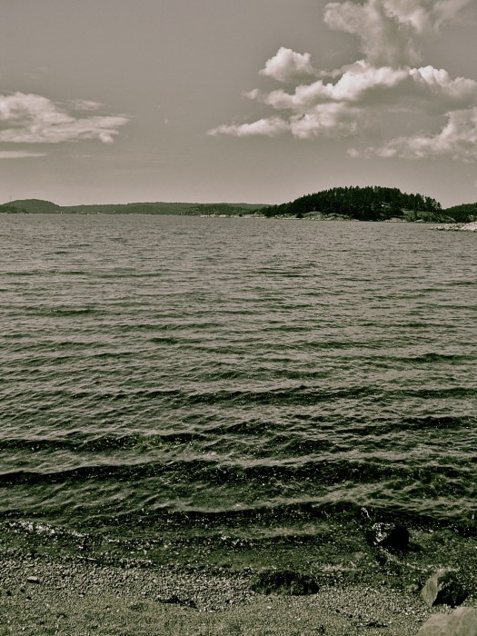 Bohusläns klippor; grått som möter grått, möter mera grått. Strandkanten, horisonten förloras i allt det gråa. Första frosten kom i natt, barfota är sanden kall och fuktig. Förlorat allt det sommarmjuka, fukten gör den tung av väta. Härifrån är steget till cementen inte långt, kunde man tänka, och ändå vickar jag lite på tårna. Ryser av ljudet som mer är en känsla, den av nagel mot sand. Och luften är klar, som den är tidiga höstdagar. Skär genom tankarna, jag lägger dem i trasor på den övergivna stranden. Tänder en cigarett och skingrar lite klarhet med rökens gift. Betraktar strumpan som ligger där på klippan, väntar på att mina fötter ska pröva vattnet, befria sig från allt de sandiga som klibbar, skaver. Löften om salt och kyla, jag väljer gräsets fukt istället. En värld av gråhet och av leda, bara cigarettens glöd och sönderkyssta läppar att lysa upp det hela. Från havet vind och saltstänk, de lägger sig över min panna, kinder, haka. Lämna mig i solen och jag smälter bort, samla saltet som ej kan dunsta? Eller skrapa det från min hud i detta nu, va? om du var här, du skulle varsamt samla all min sälta med din tunga. Vänder mig mot havet, skriker? Nej, suckar: jag dricker all din väta.