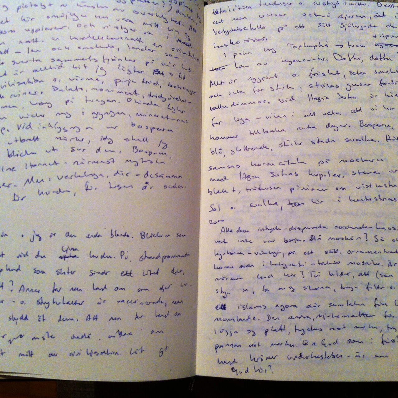 Nu har säsongen börjat ute på Drottningholm, den trogne läsaren vet att de redan sporadiska uppdateringarna då bli än mer sporadiska. Jag har dock börjat föra in anteckningarna från Istanbul, det är verkligen ett nöje, detta att skriva resedagbok. Man tänker bättre i rörelse, man ser tydligare i allt det främmande. Och: man känner sina egna konturer och gränser. Åh, om jag kunnat vara där nu, i trädgården under träden med katten vid mina fötter. Sött kardemummate och färsk frukt från basaren över bron.