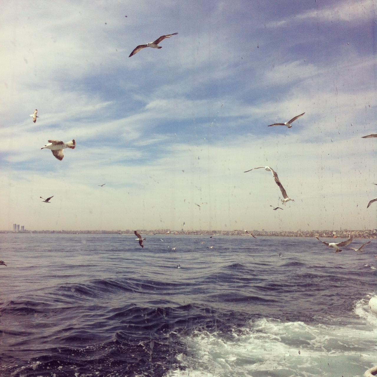 Vaknar tung i kroppen. Hyn är bränd av gårdagens sol – fötterna ömmar. Alla planer känns övermäktiga. Duschen, kalla strålar vederkvicker och vi tar metrobussen in till staden. Alla dessa resor i kvava bussar, på spårvagnar. Packade som sillar, kropparna som trycks emot varandra. Den obekväma intimiteten – oönskad. Sedan båt ut i Marmarasjön, efter farkosten som plöjer genom vattnet fiskmåsar som fångar brödbitar passagerarna kastar ut. Idag är det vaga molnslöjor över himlen – gör havet duvgrått. Stundom öppen horisont där himmel och hav förlorar sig i varandra. Färg utan transparens, allt går i ljust grått och vitt – molnstrimmor och vågtoppar. Någon enstaka blyertsfärgad kropp i allt det duvgrå: en liten kobbe, ett fartyg. Det är som simmade man på en skagenmålares palett.