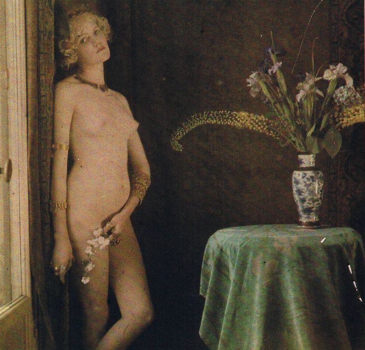 Jag älskar hur hon på en gång trotsig och nonchalant riktar blicken strax bortom kameran. Liksom uttråkad och tankfull med drag som får mig att tänka på en målning av Khnopff, en käklinje som nästan är lite maskulin i kontrast till den slanka flickkroppen. Guldarbanden och ringarna, en orm som upprepar och understryker lockarnas former i hennes hår. Det är som ett barockstilleben; bakgrundens klärobskyr, mörkret kring hennes ben. Blommorna i vasen utblommade, man kan föreställa sig den fadda doften av orkidéer, liljor, vars vatten borde bytts, blommor som borde kastats för flera dagar sedan. Den ormbunksliknande plymen ser tussig ut och gul av pollen. Gardinen, rummets intimitet får mig att tro fotot inte är taget i en ateljé, men inte heller ett hem. Jag tänker ett hotellrum. Det gula aftonljuset är inte nordens kalla utan Medelhavets, ett litet hotell av medelklass på någon badort vid franska Rivieran? I bakgrunden skymtar, vad, ännu en gardin? Det är för otydligt, ornamenten framträder som ristade i, inte väggen, utan själva bilden – det är inte längre ett hotellrum, det är en tavla av Moreau. Så mycket vemod i den där blicken. Inte känns hon utsatt eller obekväm inför kameran, hon är sin egen. Hennes tankar är någon annanstans, förlorad i en smärta som inte avslöjas för betraktaren; hon skjuter fram hakan lite och behåller sin hemlighet.